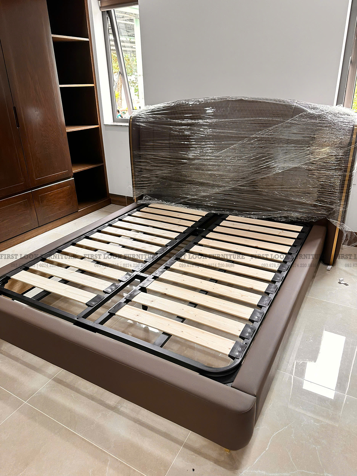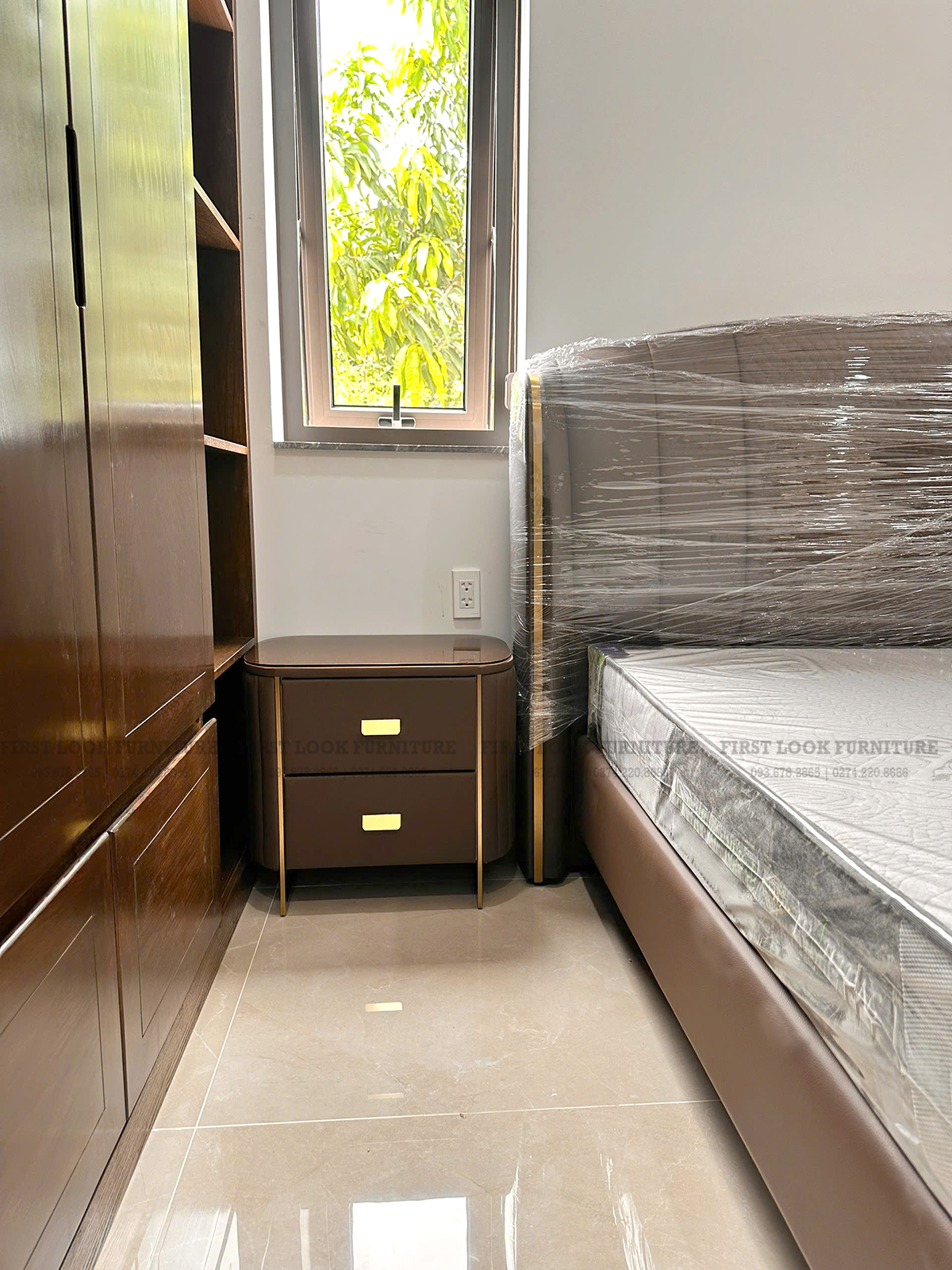 With a luxurious and modern style, the brown leather bed and nightstand set is the perfect highlight for an upscale bedroom. The natural brown tone combined with the elegant design will elevate the living space, creating a warm and noble atmosphere.