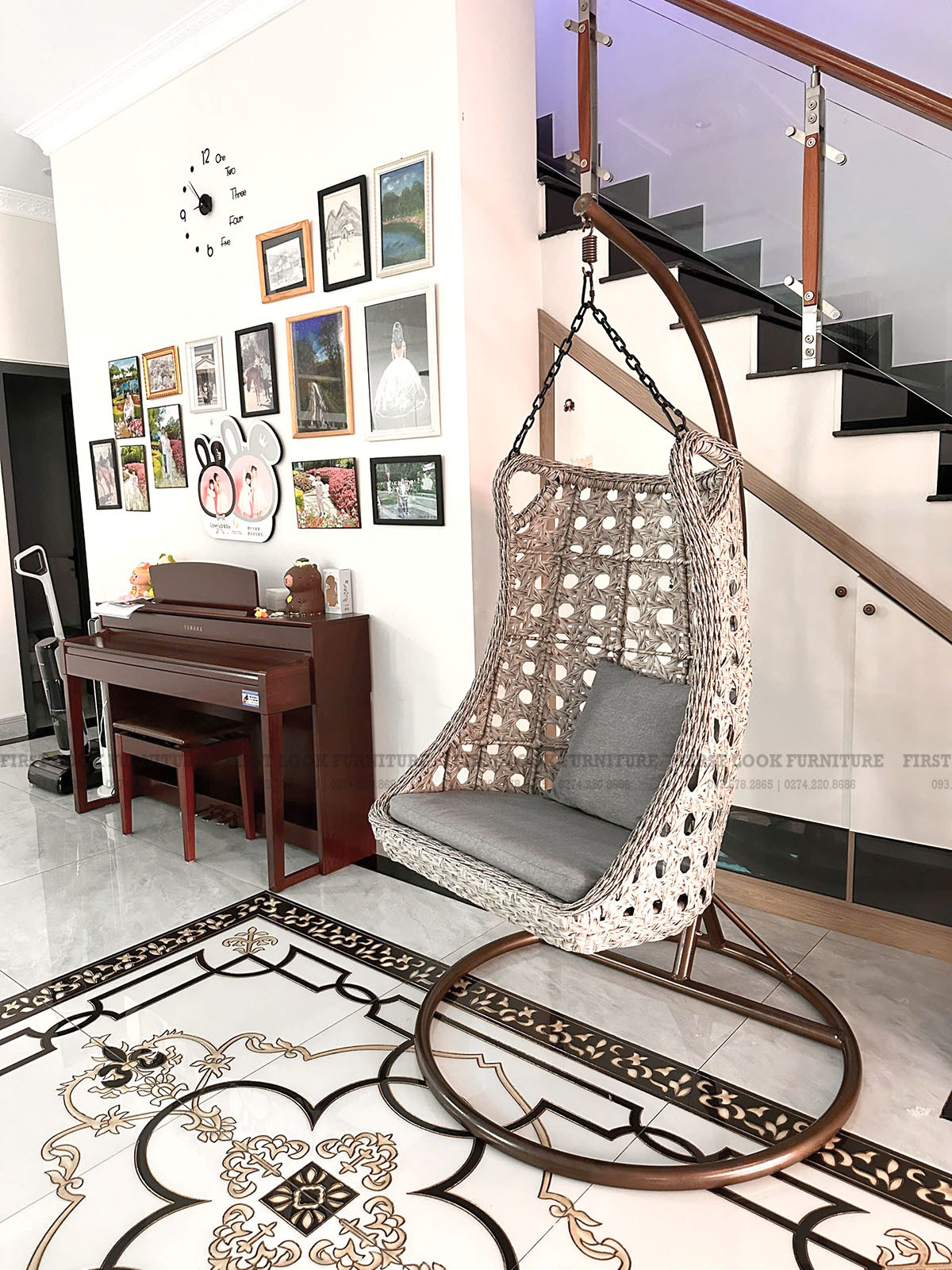 The combination of a relaxing swing, a charming little coffee table, and a decorative vase creates a gentle, peaceful space – where you can sip tea, read a few pages of a book, or simply sit quietly in the sunny afternoon.