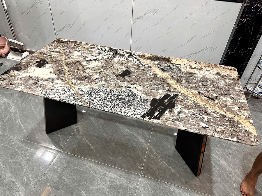 Bộ bàn ăn mặt đá tự nhiên gây ấn tượng bởi vẻ đẹp sang trọng và bền vững, từng đường vân đá mang nét độc bản, góp phần nâng tầm không gian phòng ăn. Bề mặt đá mát tay, chắc chắn, dễ vệ sinh, phù hợp với nhịp sống hiện đại nhưng vẫn giữ được cảm giác ấm cúng.