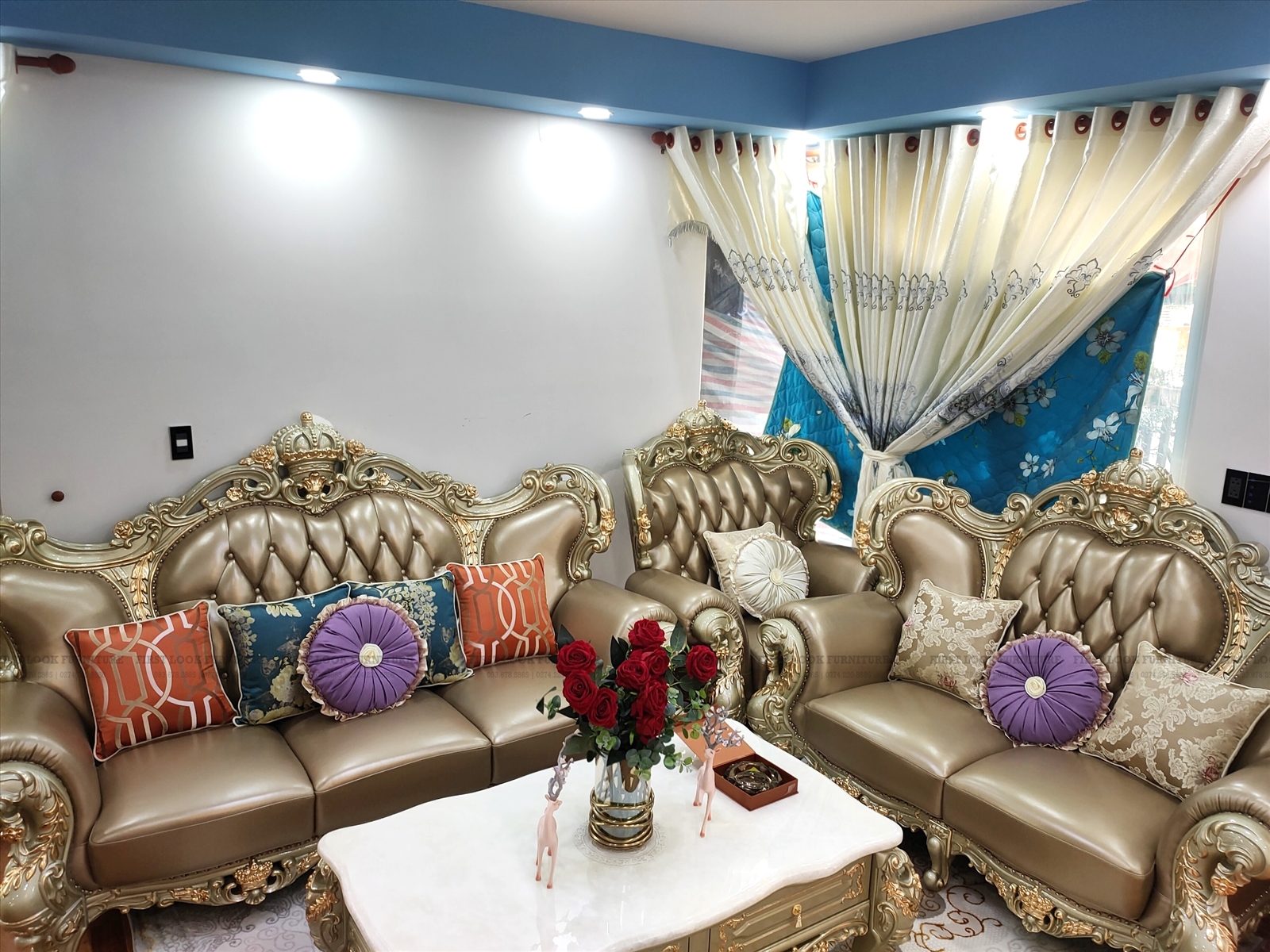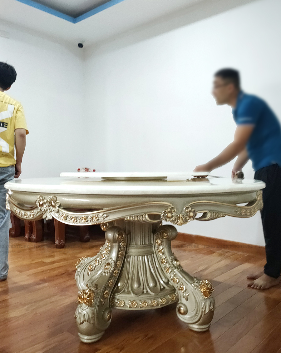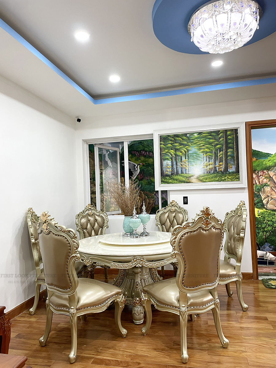 Từng đường nét chạm khắc tinh xảo, ánh vàng lấp lánh được phủ thủ công tỉ mỉ, kết hợp cùng chất liệu gỗ tự nhiên cao cấp và thiết kế mềm mại mang đến sự hoàn hảo tuyệt đối. Bộ sofa sang trọng cùng bàn ăn tròn cổ điển tone vàng tạo nên một tổng thể thống nhất – vừa bề thế, vừa tinh tế – biến ngôi nhà trở thành không gian nghệ thuật đầy kiêu hãnh.
